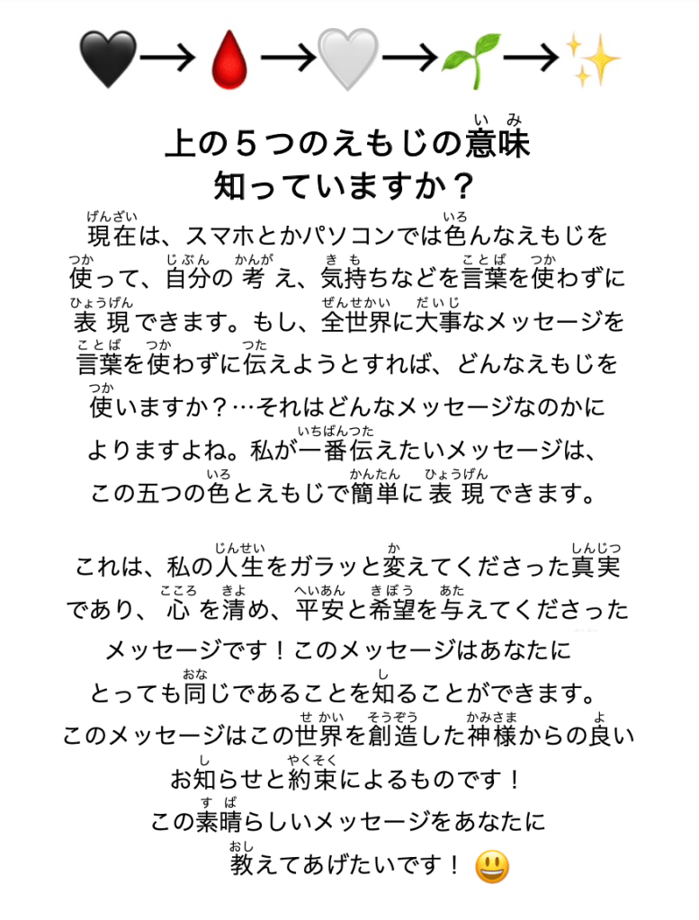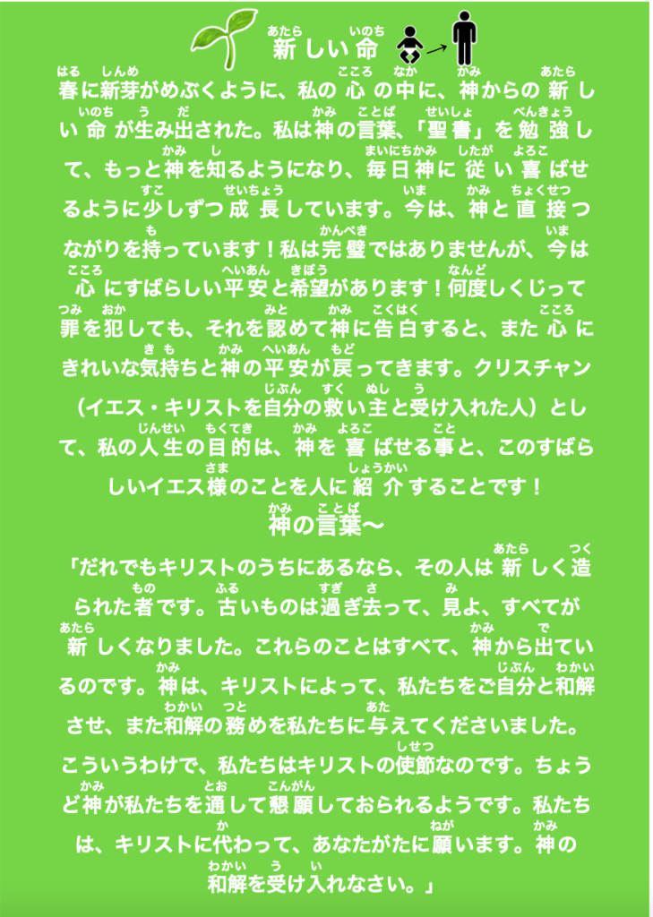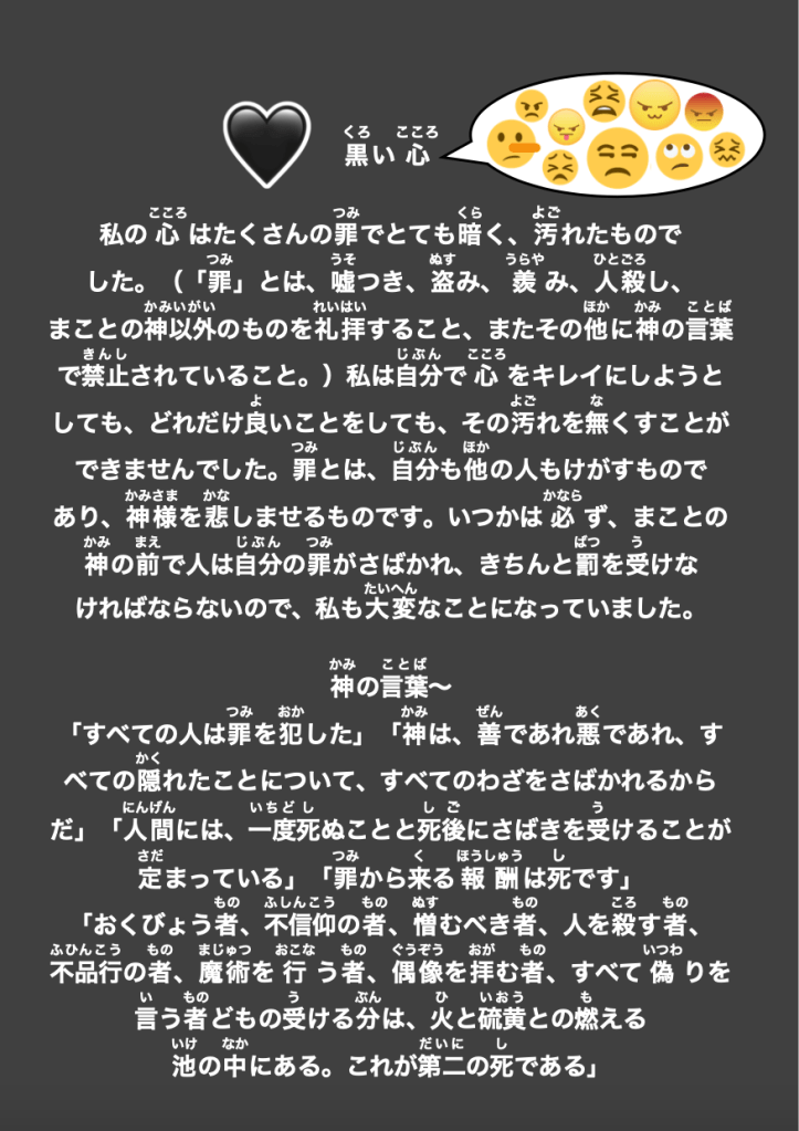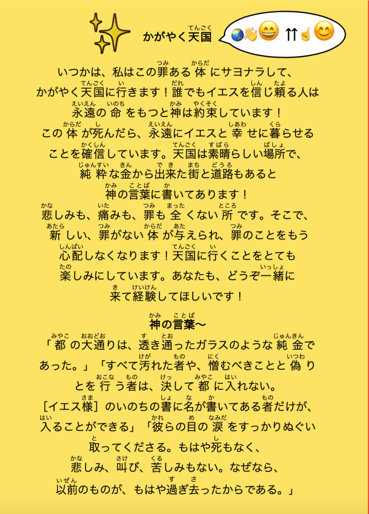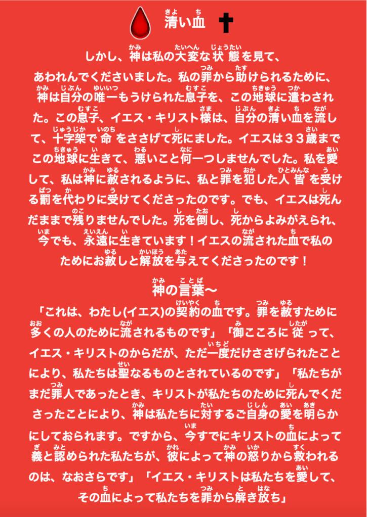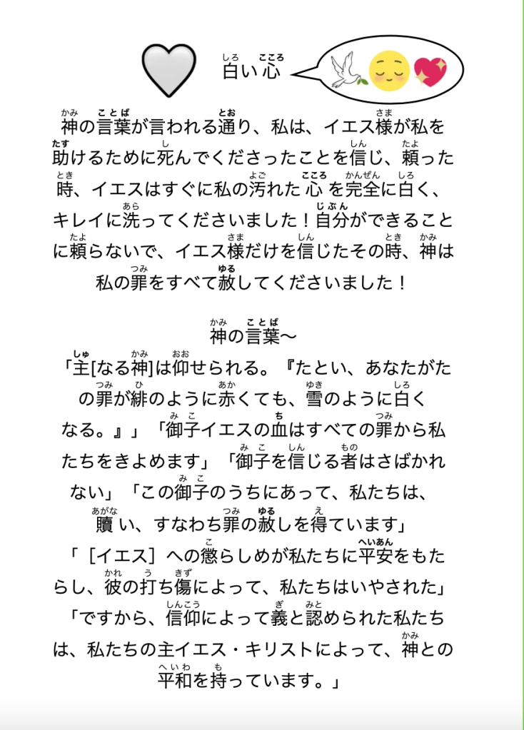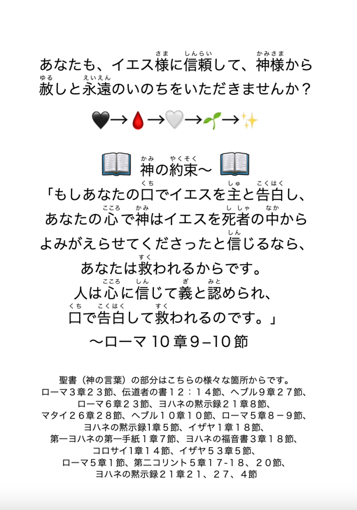 聖書に従うキリスト信者は、何を信じているのでしょうか⁉️🧐 世界をすべて創造したのは唯一神であって、すべての人は不信仰と不従順により唯一神から離れ、これによって一人一人は死後に正しいさばきと罰(地獄で)を受けなければならないと信じています。けれども、聖書に示されている、人々への神の愛と人々を救うご計画にしたがって、世に遣わされた神の息子イエス・キリストにより、人は神のさばきから救われる方法があると信じています。イエス・キリストは苦しみながら、十字架で命をささげ、ご自分の血で人の違反の代価を支払ったことで、人を神に和解させる力があると信じています。人は誰であっても、自分勝手な生き方(罪)を悔い改めて、イエス・キリストを自分の主として信じ受けるのなら、神のさばきから救われ、神の恵みとあわれみによりゆるしと永遠の命(天国で)を得ると信じています。 このパンフレットには、目が引かれるような絵文字メッセージが ちょこちょこ出ます。フリガナもあり、内容も理解しやすく、 大人も子ども向けの年中お使えができるパンフレットとして おすすめします。 印刷すると、パンフレットの一番後ろは余白ページです。 ぜひ、主の導きがあれば、個人のメッセージや通っている教会のお名前と お問合せ先などを入れるページとしてお使いください。